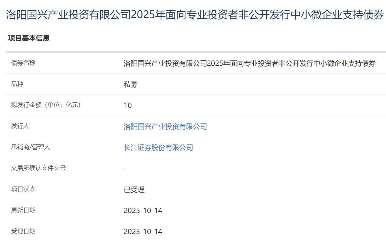 【大河财立方消息】10月15日消息,洛阳国兴产业投资有限公司2025年面向专业投资者非公开发行中小微企业支持债券项目获上交所受理。本期债券拟发行规模10亿元,承销商/管理人为长江证券。