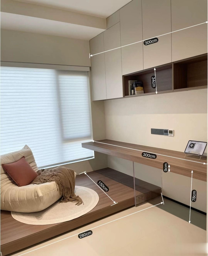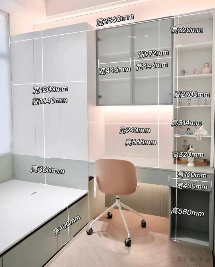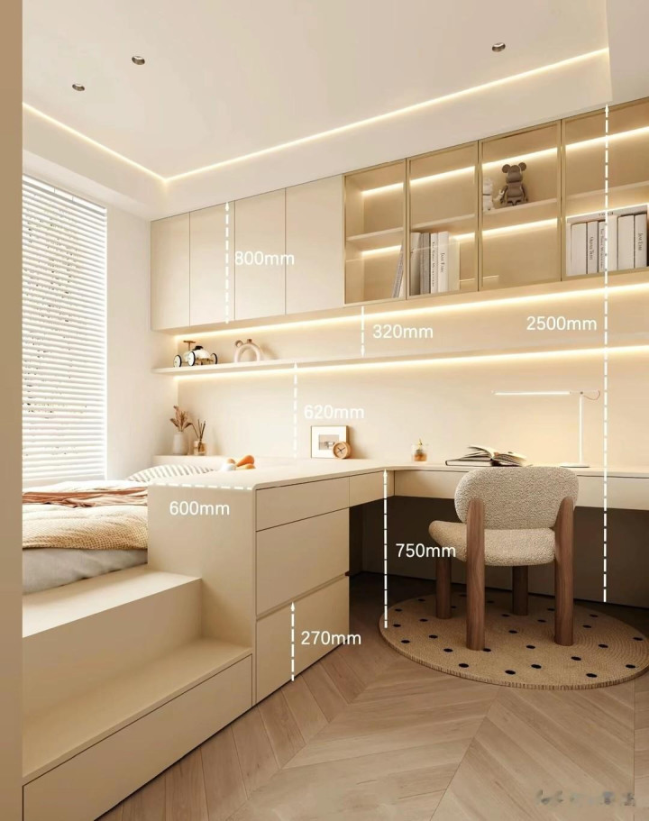 通过实践的反复印证,榻榻米设计的症结,款式是一方面,更重要的是布局尺寸的精准把控,尺寸设计一旦失之毫厘,使用体验便会谬以千里——收纳取物受阻,活动动线局促等问题接踵而至。
